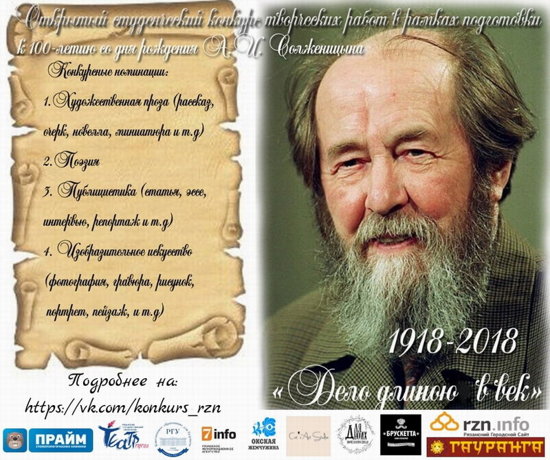 Научно-просветительский центр по изучению наследия А.И. Солженицына РГУ имени С.А. Есенина проводит Открытый студенческий конкурс творческих работ в рамках подготовки к 100-летию со дня рождения выдающегося русского писателя, лауреата Нобелевской премии по литературе А.И. Солженицына.