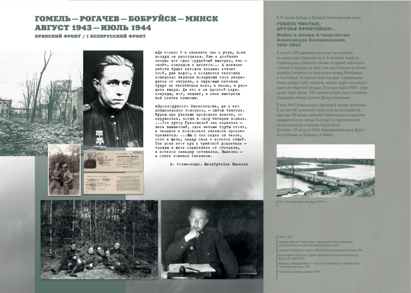 Государственный музей истории российской литературы имени В.И. Даля представляет выставку репродукций документов, фотографий, рукописей и мемориальных предметов из Центрального архива Министерства обороны Российской Федерации, фондов ГМИРЛИ имени В.И. Даля и личного архива Александра Солженицына, приуроченную к годовщине Победы в Великой Отечественной войне.